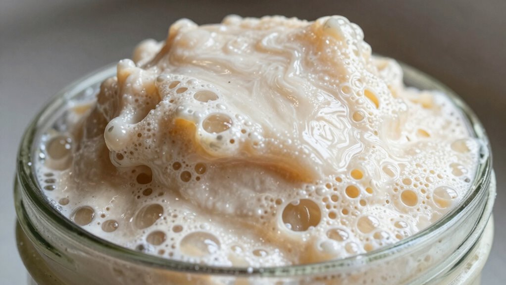 If your sourdough starter is overfed, it might look sluggish or inactive, with minimal bubbling and a bad or off smell. You’ll notice a layer of liquid, called hooch, on top, which indicates microbes are struggling. The starter may also fail to double in size after feeding. These signs show an imbalance caused by too much food. Keep an eye on these clues, and you’ll discover tips to restore your starter’s health.