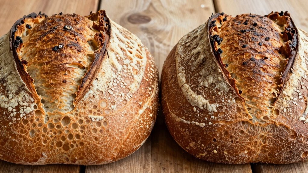 In essence, the puffy loaf’s lightness comes from a fermentation process that maximizes gas production and a gluten network that’s highly elastic. Conversely, a strong loaf emphasizes gluten development that’s more resilient and less prone to expansion, giving it the sturdiness you feel when biting into it. Controlling fermentation is crucial to achieving the desired loaf type, as it directly influences the gas retention and gluten structure. By paying attention to how you handle the dough—how long you ferment it and how you develop its gluten—you can influence whether your bread ends up puffy or strong. Additionally, understanding the fermentation process can help you optimize your bread’s texture and flavor. Ultimately, understanding these internal processes helps you tailor your baking to achieve the exact texture and structure you desire.