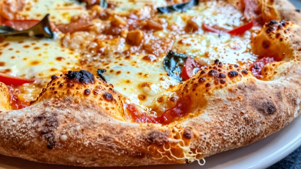 Fermentation time considerably impacts crust texture by allowing fermentation byproducts like carbon dioxide to develop fully, which causes gas expansion. This process creates a thicker, more developed crust as the dough’s structure strengthens. Longer fermentation also enhances flavor and moisture retention, often resulting in a thicker crust. If fermentation is rushed, the crust remains thinner and less developed, affecting overall crumb moisture and texture.