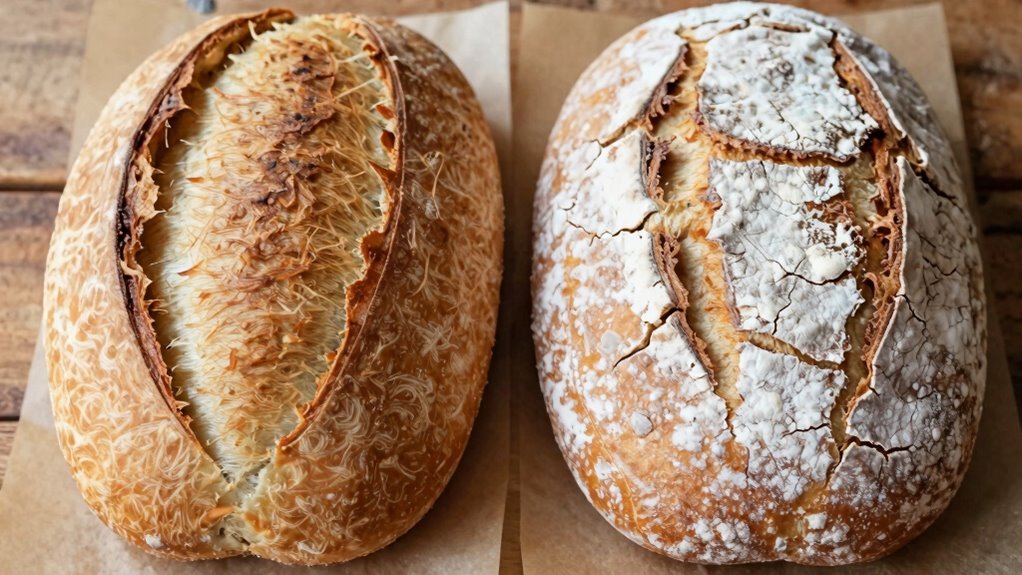 The choice of surface considerably influences how your dough makes contact and expands during baking. When you use parchment, it creates a non-stick barrier that reduces dough adhesion, allowing the dough to glide smoothly and maintain its shape. This surface contact prevents sticking and tearing, enabling even expansion. Without parchment, the dough directly contacts the baking surface, which can increase adhesion and hinder surface contact. This might restrict dough expansion and cause uneven oven spring, especially if the surface is too sticky or uneven. Parchment ensures consistent contact, promoting ideal dough expansion and a better oven spring. By minimizing adhesion, parchment helps your dough expand freely, resulting in a lighter, more evenly risen loaf.