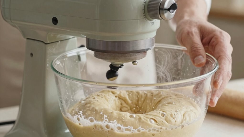 You’ll notice over-kneading at high speeds when gluten development becomes excessive, making the dough tough and overly elastic. The dough’s consistency shifts from smooth and elastic to overly stiff and resistant, losing its ability to stretch easily. It may also snap back quickly when you poke it, indicating it’s been kneaded too much. Keep an eye on these signs to prevent over-kneading and guarantee your bread turns out perfect.