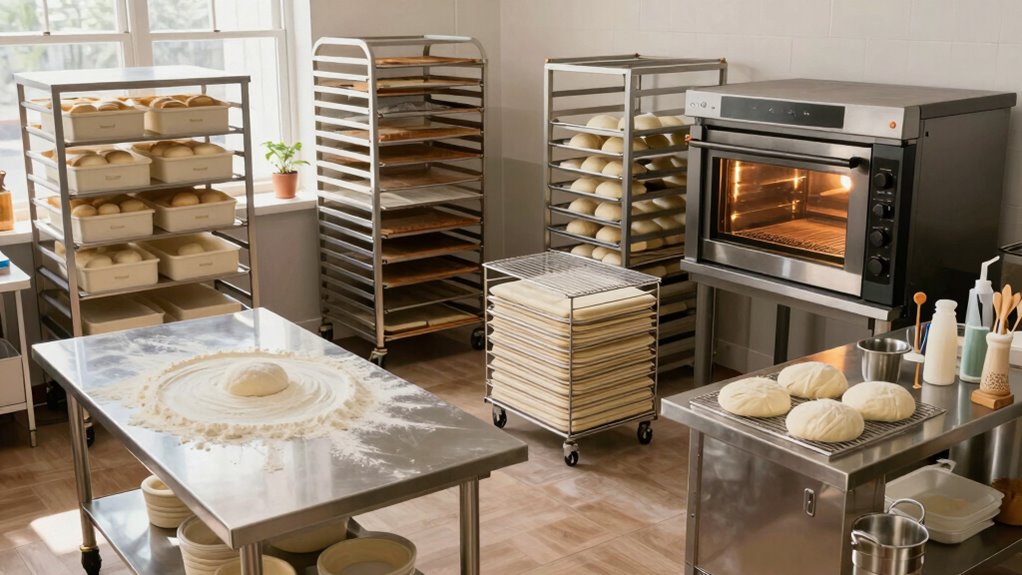 Have you ever wondered how a well-organized baker’s station boosts efficiency? The 5-zone layout is designed to streamline your workflow by dividing your workspace into specific areas. Proper bread storage is a key component, ensuring ingredients stay fresh and accessible. It also helps prevent cross-contamination, supporting good sanitation practices. When each zone has its designated function, you minimize clutter and reduce movement, making your baking process smoother. This setup encourages cleanliness, making it easier to keep your station sanitized and hygienic. Additionally, implementing systematic organization can further optimize your setup and improve overall productivity. Incorporating ventilation considerations ensures a safe and comfortable environment, especially in busy bakeries. Being aware of power supply needs is also crucial to ensure that all equipment operates efficiently throughout the day. Understanding workflow optimization techniques can help you fine-tune your layout for maximum efficiency. Overall, the 5-zone layout improves productivity, safety, and cleanliness, helping you deliver consistent, high-quality baked goods efficiently.