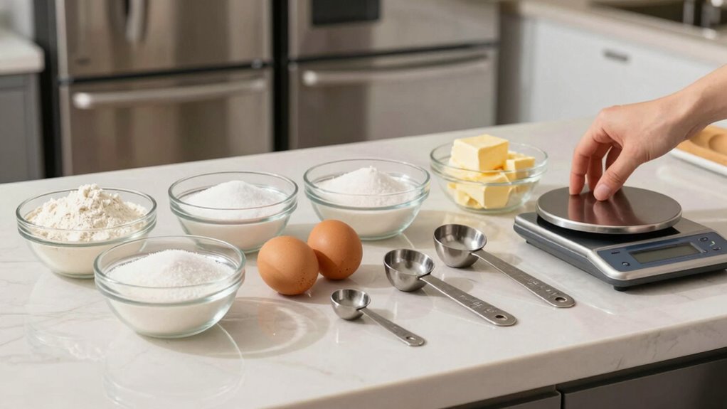 Once you’ve collected all your ingredients, the next step is to guarantee each measurement is precise. Accurate ingredient measurement ensures ingredient accuracy and helps your baked goods turn out just right. Use proper tools like a digital scale for dry ingredients and graduated measuring cups for liquids to achieve measurement consistency. Avoid eyeballing or estimating, as small deviations can cause big problems, like dense textures or flat cakes. Level off dry ingredients with a straight edge for consistency, and always read liquid measurements at eye level. Consistent measuring techniques reduce errors and improve your baking results. Taking these extra seconds to measure carefully ensures your recipes are reliable and taste as intended every time. Proper measurement sets the foundation for successful baking.