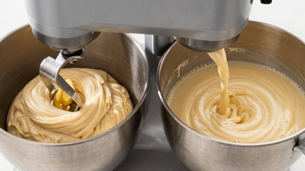 Did you know overmixing can lead to tough pastries? You’ll notice overmixing during continuous mode if the batter becomes too smooth or shiny, indicating too much gluten development, which affects mixing consistency and texture outcomes. Undermixing shows as lumps or dry spots, leading to uneven baked goods. In pulse mode, inconsistent mixing can cause uneven texture, while in continuous mode, it produces overly dense or crumbly results.