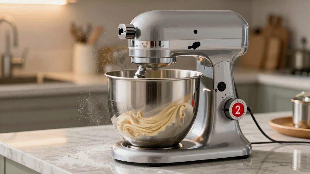 Using Speed 2 incorrectly can lead to mixing issues and uneven results. One common mistake is overmixing, which can ruin delicate ingredients or develop gluten in bread dough unnecessarily. To avoid this, monitor your mixing time and ingredients closely. Additionally, neglecting safety precautions, like keeping your hands away from the beaters or not securing attachments properly, can cause accidents or damage your mixer. Speed 2 is powerful enough to incorporate ingredients efficiently, but it’s easy to go overboard if you’re not cautious. Always start at a lower speed and gradually increase if needed. Pay attention to your recipe’s instructions, and don’t rely solely on intuition. Proper technique and awareness of overmixing pitfalls will help you achieve consistent, high-quality results.