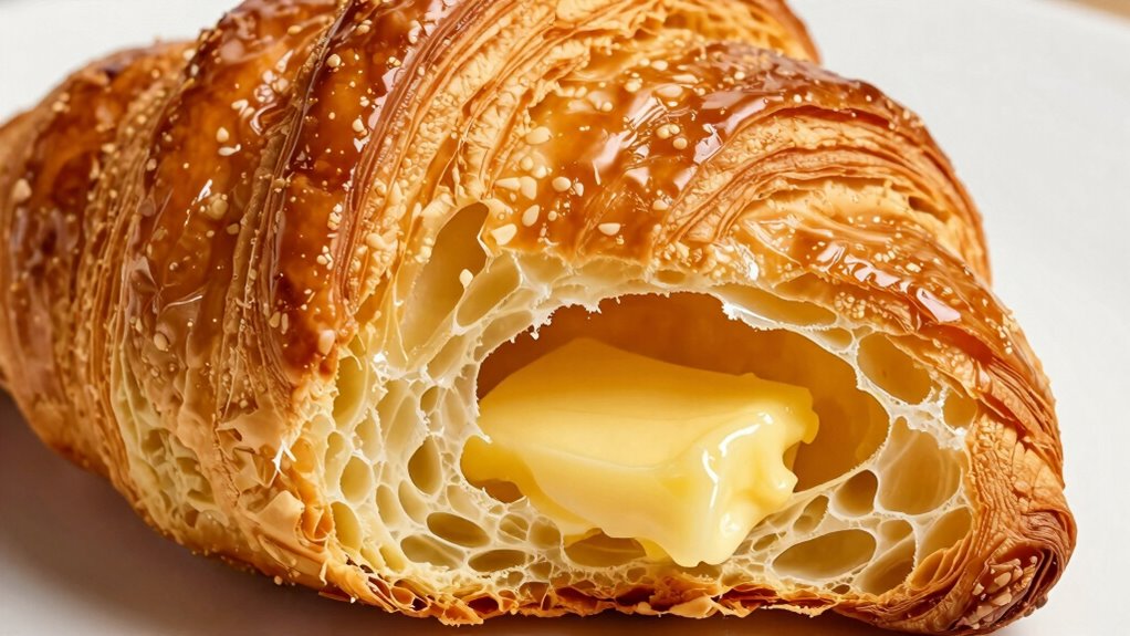 One of the most common pitfalls when making croissants is mishandling butter temperature, which can compromise lamination and texture. If the butter is too cold, it resists shaping, reducing dough elasticity and making layers difficult to create. Cold butter also dulls the butter flavor, resulting in a bland croissant. Conversely, if the butter is too warm, it becomes greasy and leaks out during rolling, ruining the lamination process. This affects not only the structure but also the overall butter flavor, making the croissant greasy rather than flaky. Proper butter temperature guarantees ideal dough elasticity and maintains the delicate balance needed for perfect lamination. Paying close attention to butter temperature is vital for achieving the desired texture, flavor, and flaky layers in your croissants.