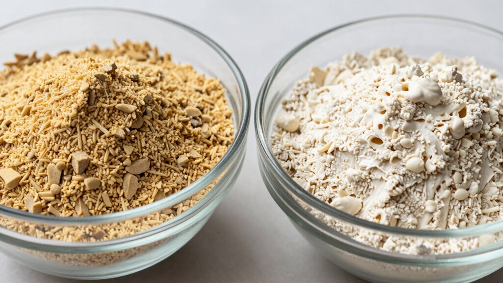 You’ll notice some organic differences in water absorption compared to conventional variation. Organic flour often absorbs more water because it contains fewer additives and preservatives, allowing the natural starches and proteins to interact more freely. Conventional flour may have additives that slightly inhibit absorption or alter its hydration properties. So, when baking, expect organic flour to require a bit more water to achieve the same dough consistency as conventional flour.