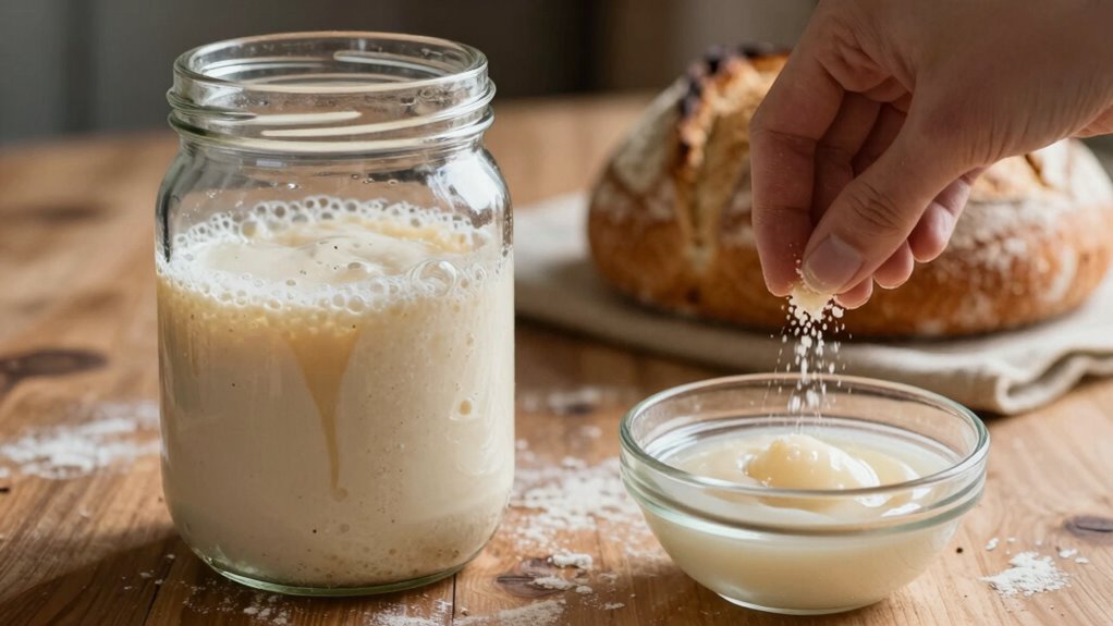 Transitioning from commercial yeast to a sourdough starter involves patience and attention to your fermentation timeline. Don’t rush the process; allow your starter to develop strength over a week or more. During this period, you might need to discard some starter and feed it more frequently to keep it healthy and active. As your starter matures, you’ll observe it becoming more resilient, with a balanced acidity and consistent rise. This ongoing starter maintenance ensures your culture remains vigorous, providing a reliable base for baking sourdough bread. Once your starter is consistently bubbly and doubling in size within a few hours of feeding, you can incorporate it into your bread recipes, replacing commercial yeast with confidence. This natural fermentation process, though slower, produces superior flavor and texture, rewarding your patience and care with exceptional sourdough loaves.