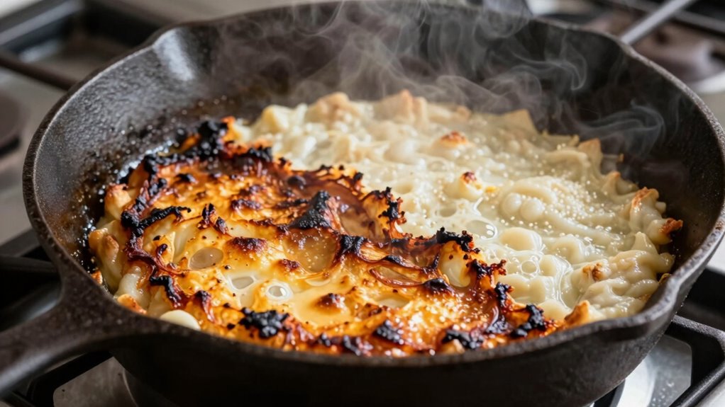 Your choice of pan material greatly influences heat distribution, which affects hot spot formation. For instance, copper and aluminum pans offer excellent heat conduction, minimizing hot spots. Cast iron distributes heat evenly but retains it longer, reducing uneven cooking. On the other hand, stainless steel pans may have uneven heat distribution unless layered with a conductive core. Selecting the right cookware guarantees more uniform cooking and less chance of hot spots.