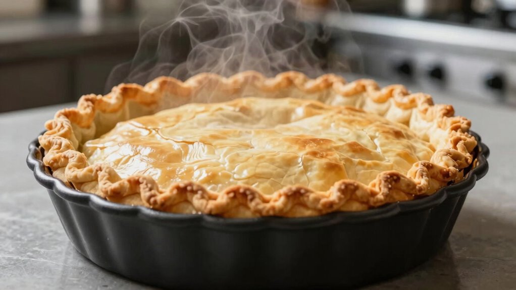 Steam naturally forms inside your pie crust as moisture evaporates from the filling or the dough itself heats up. Without a way to escape, this steam traps moisture, making your crust soggy and limp. To prevent this, you need effective steam traps—small holes or vents in your pie plate that allow moisture to escape. Proper oven temperature helps generate enough steam to lift moisture out efficiently. When you trap steam too well, it condenses back into the crust, creating sogginess. Here’s how it feels: