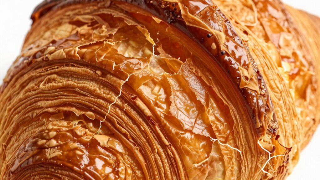 Understanding why layers break during croissant lamination helps you perfect your baking. Remember, even a tiny tear can cause layers to collapse, so handle your dough gently. Did you know that over 60% of bakers report lamination issues at least once? By maintaining proper temperature and careful folding, you’ll reduce this risk considerably. Keep practicing, stay patient, and soon you’ll achieve those beautifully flaky, perfectly layered croissants you’ve been dreaming of!