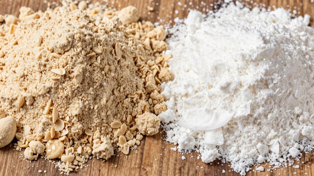 When choosing between almond flour and coconut flour, understanding their differences can help you make the best choice for your diet and recipes. Both are popular gluten-free alternatives to wheat flour, but they have distinct properties that affect how you use them in baking. A key factor is their nutrition comparison. Almond flour is made from finely ground almonds, making it high in healthy fats, protein, and vitamin E. It provides more calories per serving and contributes to sustained energy. Coconut flour, on the other hand, is derived from dried coconut meat. It’s low in fat, high in fiber, and contains medium-chain triglycerides (MCTs), which are known for their quick energy boost. Knowing these differences helps you tailor your recipes to your nutritional goals, whether you want more protein and healthy fats or a fiber-rich option.