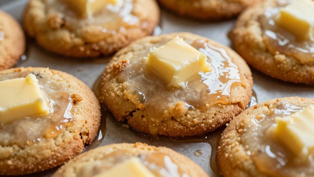 The temperature of butter plays a crucial role in determining how cookies spread during baking. When butter is too warm, its melting behavior causes rapid spreading, leading to flatter, greasier cookies. Conversely, cold butter resists melting, resulting in thicker, more structured treats. Understanding butter crystallization helps explain this: well-crystallized butter melts more slowly, affecting spread. Proper butter temperature ensures consistent texture and appearance. Additionally, water content influences how butter behaves during baking, impacting cookie texture and spread. Recognizing the melting point of butter allows bakers to better control cookie outcomes. Temperature control also impacts emulsification, which influences the butter’s ability to incorporate air and affect final texture. Moreover, maintaining the correct butter temperature can minimize undesirable clumping during mixing, leading to a smoother dough.