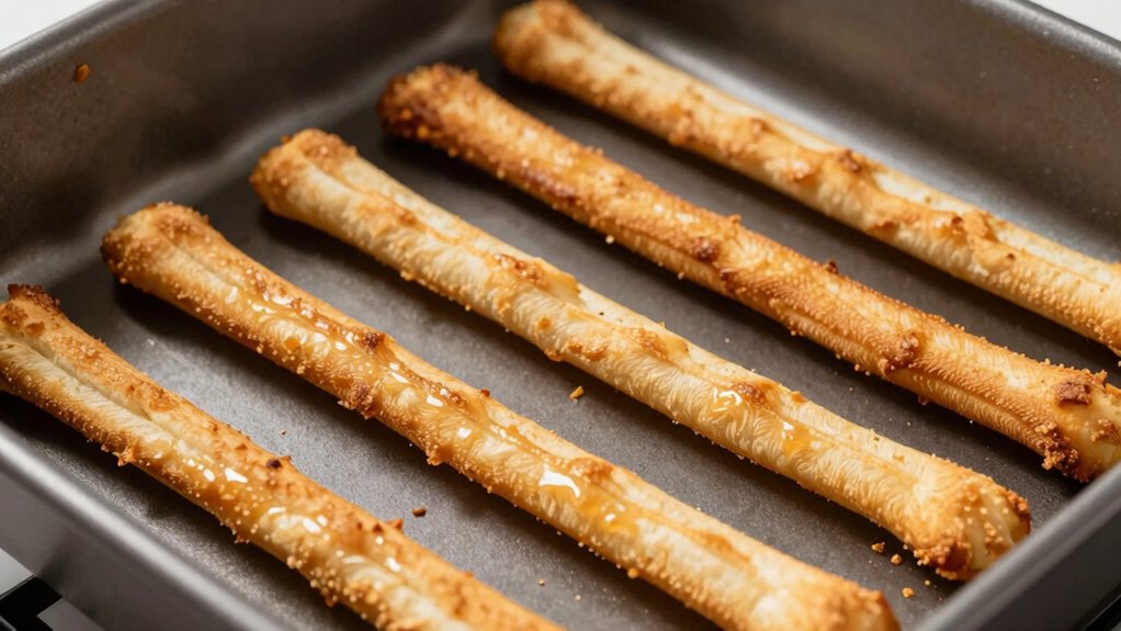 This approach guarantees cleaner, easier bread stick removal. Additionally, understanding pan materials can help optimize your greasing method for consistent results. Recognizing the non-stick properties of different pans can also influence your choice of greasing technique, ensuring optimal results each time.