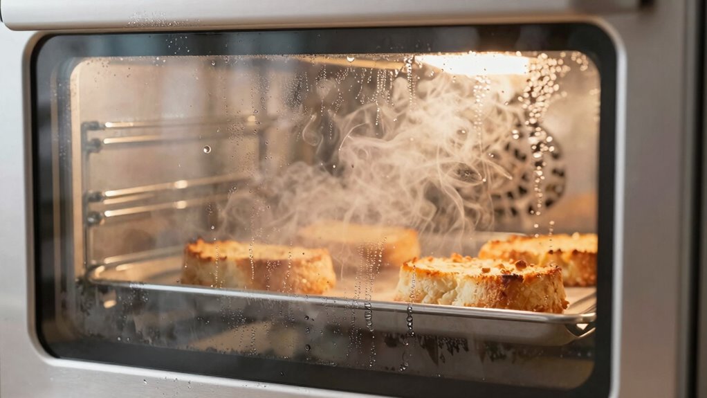 Condensation occurs inside steam ovens because the water vapor produced during cooking cools upon contact with cooler surfaces, turning back into liquid droplets. This process leads to humidity buildup inside the oven, increasing interior moisture levels. As the steam hits the cooler walls or racks, it condenses, creating water droplets that cling to surfaces. The more moisture generated during cooking, the greater the likelihood of condensation. Additionally, if the oven isn’t properly ventilated or if the door is opened frequently, humidity buildup accelerates, making condensation more persistent. Proper ventilation is also essential in regulating humidity and reducing condensation buildup inside the oven. Ensuring the oven has adequate Humidity control can help dissipate excess moisture and reduce condensation issues. Proper circulation of air within the oven can further help in maintaining optimal climate control and preventing excessive moisture accumulation.