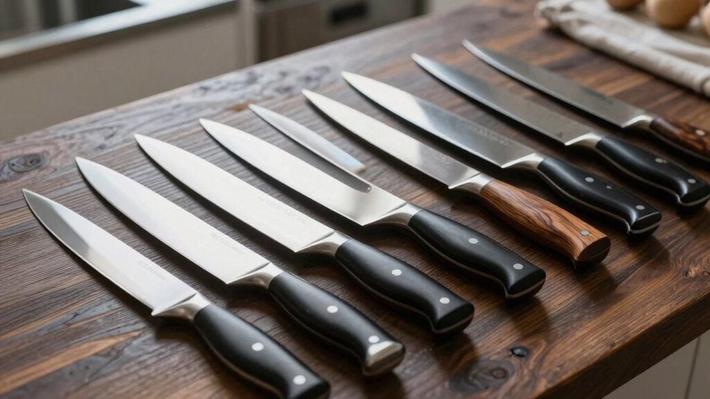 Think of steel types like various paints on an artist’s palette—each affects the final masterpiece differently. High-carbon steels, like a bold crimson, offer sharp edges that stay longer, ensuring precision with less frequent sharpening. Stainless steels, akin to a sleek metallic silver, resist rust but may need more frequent honing. The choice impacts how well your knife retains its edge through daily use, guiding your selection based on your cooking style.