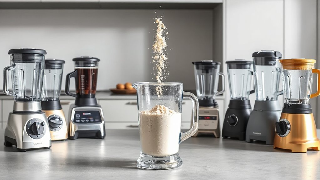 Imagine a whirlwind spinning with grains—these blenders don’t just handle oats; they’re versatile enough for other grains like rice, wheat, and barley. I’ve tested them with various textures, and they smoothly grind everything into fine flour. Their powerful motors and sharp blades make quick work of different grains, so you can experiment freely. Whether it’s millet or spelt, these blenders are up for the challenge anytime you want fresh, homemade flour.