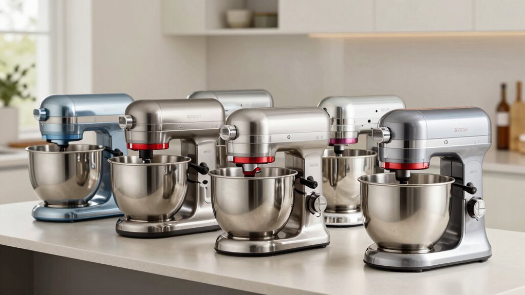 Handling gluten-free bread dough is like maneuvering a tricky dance—requires delicate control. I’ve found these mixers work well for gluten-free recipes, thanks to their powerful motors and sturdy construction. They mix thoroughly without overworking the dough, which is essential for gluten-free bread’s delicate texture. So, if you’re making gluten-free bread, these mixers deliver the gentle yet effective kneading needed for a perfect loaf every time.