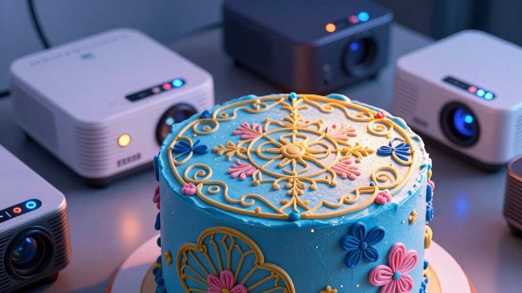 Think of a cake decorating projector as a magic wand that helps you transfer intricate designs onto your cake. Yes, you can absolutely use it for edible image transfers. I’ve found it’s like casting a precise spell, making detailed images easy to place perfectly on your cake’s surface. Just project your chosen design onto edible paper, and you’re ready to impress with professional-looking decorations that taste as good as they look.