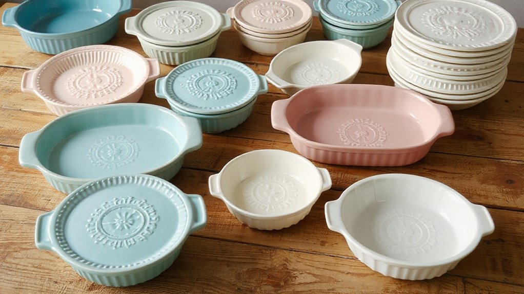 Choosing a ceramic baking dish set that’s both safe and durable is essential for worry-free cooking and long-lasting performance. I look for dishes made from high-quality, lead-free, non-toxic materials to guarantee safety during baking and serving. It’s critical that the ceramic is chip-resistant, crack-proof, and able to withstand frequent use without degrading. I also check that the glaze is non-porous, resisting stains, scratches, and moisture absorption, which helps maintain its appearance and hygiene over time. Additionally, I prefer dishes that are oven, microwave, and dishwasher safe, indicating they can handle thermal and mechanical stresses. Thermal shock resistance is necessary too, preventing cracks or breaks when moving dishes between different temperature environments. These factors give me confidence in both safety and durability.