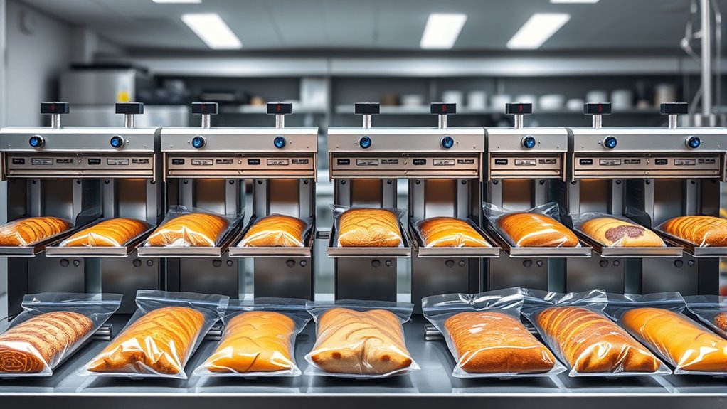 You might worry about safety features in commercial sealers, but they’re essential for your peace of mind. I always look for automatic shut-off systems, emergency stop buttons, and safety guards that prevent accidental contact with moving parts. These features safeguard my staff and ensure smooth operation. Investing in sealers with these safety measures means fewer accidents and more efficient production, making safety a top priority in my bakery.