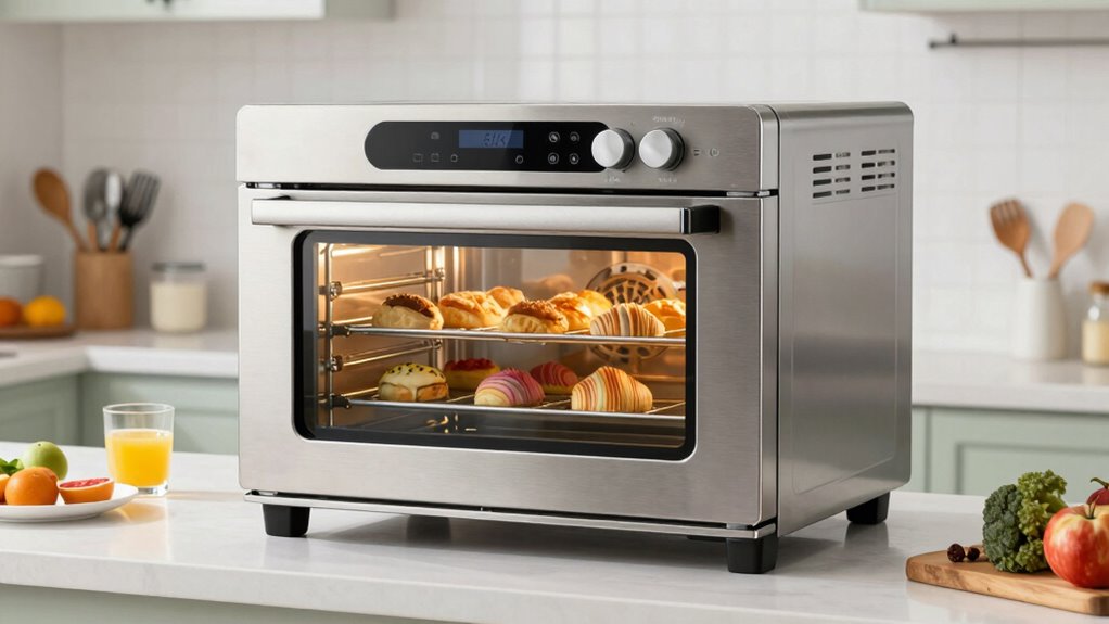 Preset cooking functions can greatly simplify baking multiple trays by providing optimized settings for different tasks. With functions like bake, roast, broil, dehydrate, and toast, I can switch between modes with just one touch, saving time and effort. These presets often come with specific temperature and time settings tailored to each task, ensuring consistent, reliable results. Many ovens even include dedicated multi-tray or multi-layer presets, allowing me to cook multiple trays evenly without flavor transfer. Advanced models let me save custom presets, which is perfect for my frequent recipes. Overall, preset cooking functions boost convenience, reduce guesswork, and make multitasking in the oven more efficient, ensuring my baked goods come out perfect every time.