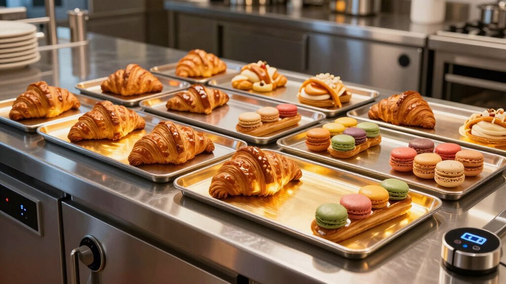Think of warming trays as versatile stage managers for your pastries—they adapt seamlessly to different types and textures. I’ve found they keep flaky croissants crisp and delicate macarons perfectly warm, while also gently maintaining the softness of bread. These trays provide even heat distribution, ensuring each pastry retains its ideal texture without overcooking. They’re genuinely suitable for a variety of pastry styles, making your baking process more flexible and efficient.