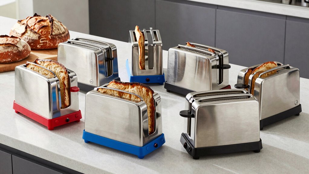 Safety features are vital when choosing an electric bread slicer for home use. I look for models with safety guards to prevent accidental cuts, non-slip feet for stability, and automatic shut-off to avoid overheating. A blade lock ensures the blade stays secure during operation, and easy-to-access emergency stop buttons provide quick control. These features keep me confident and safe while slicing bread, making the experience both enjoyable and secure.