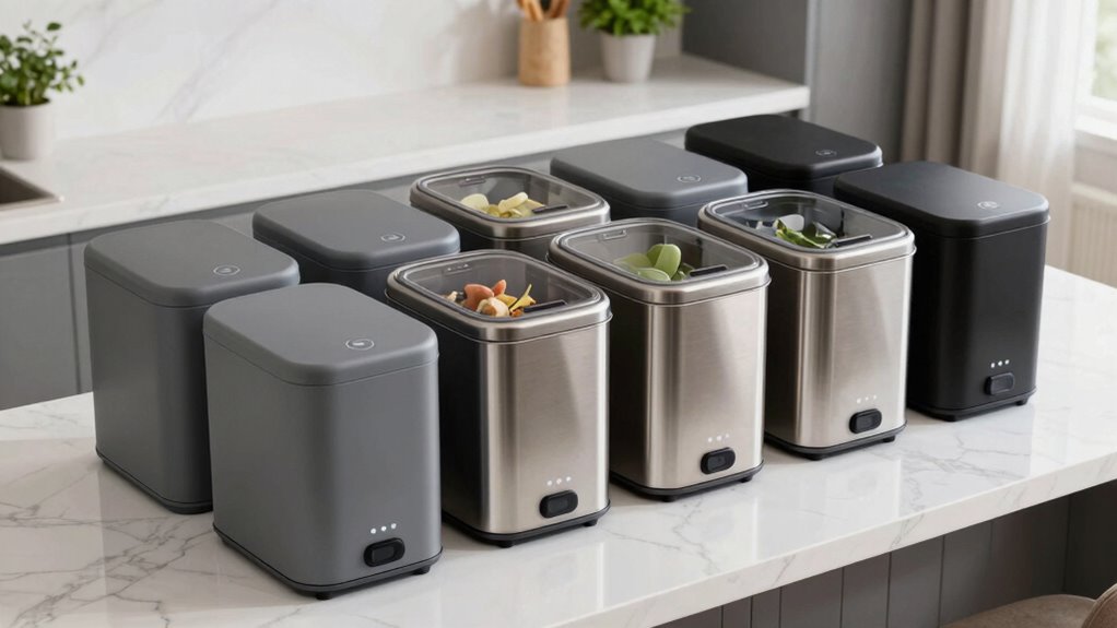 If you’re looking for the 15 best electric compost bins for your kitchen in 2026, I’ve found options that combine quick waste processing, odor control, auto-cleaning, and sleek designs. These units can turn food scraps into nutrient-rich compost in just a few hours, with features like smart modes and quiet operation. With various sizes and advanced tech, these composters fit different needs and lifestyles. Keep exploring to discover the top choices that suit your eco-friendly kitchen goals.