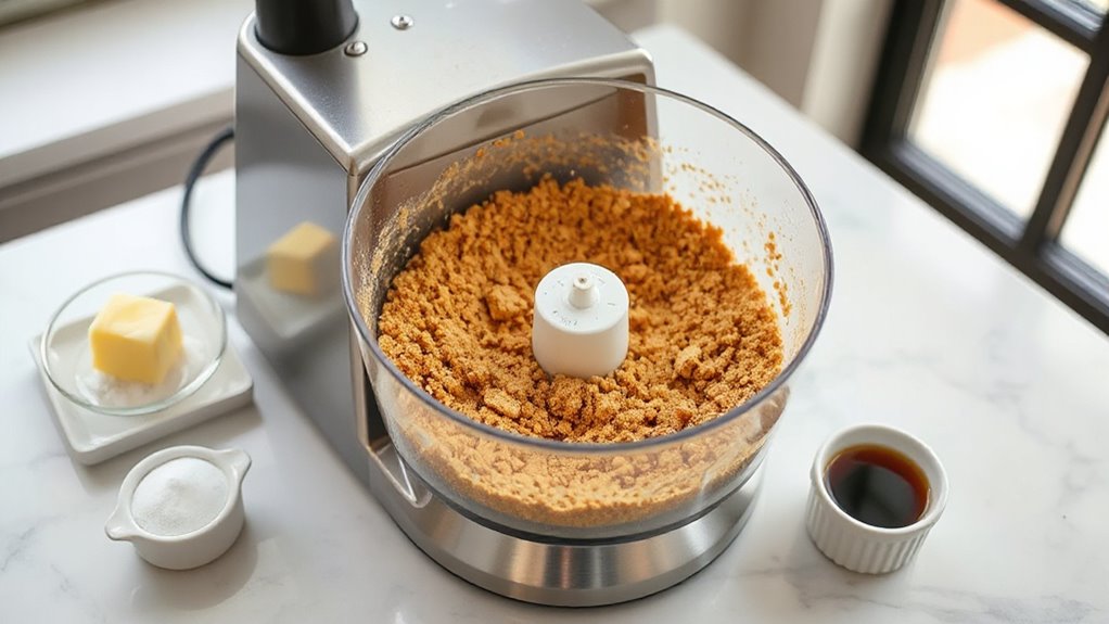Absolutely, there are specific settings that help you achieve perfect cheesecake crust crumbs. I typically start by pulsing the ingredients in short bursts, keeping the processor on low or medium speed. This creates a fine, sandy texture, like beach sand, without over-processing into dough. Watching the crumbs gather evenly around the blades signals I’ve hit the sweet spot. Adjust the speed as needed to get those perfect, consistent crumbs every time.