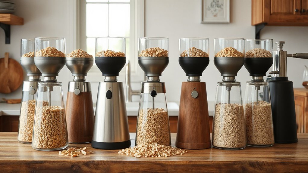 I’ve found that energy efficiency varies among different grain mill types. Manual mills use very little power but require effort, making them eco-friendly but labor-intensive. Electric models, especially those with modern motor technology, tend to be more energy-efficient than older designs. I recommend looking for mills with energy-saving features like automatic shut-off or variable speed controls. Overall, electric mills with efficient motors strike a good balance between power use and performance.