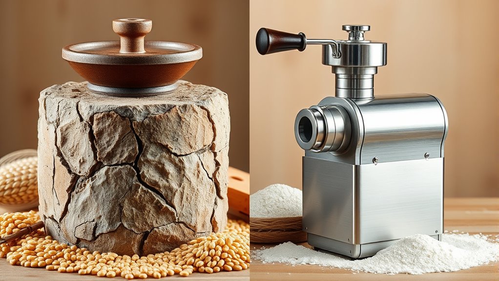 Milling speed varies between stone and steel grain mills, with steel mills generally operating faster due to their design. Steel mills can process grains more quickly because they have higher rotational speeds and less friction. However, I’ve found that stone mills often produce a more traditional, textured flour, though they might take a bit longer. So, if speed’s your priority, steel mills are usually the better choice, but for quality, stones excel.