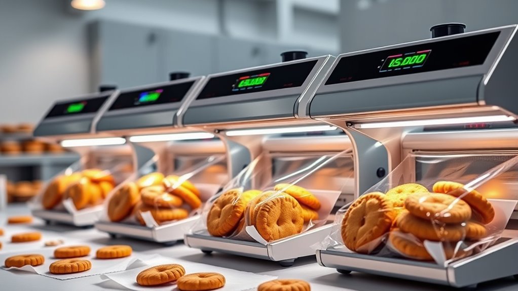 Adjustable temperature settings are key to achieving perfect seals on different types of cookie bags. They allow me to fine-tune the heat based on the specific plastic material, ensuring a secure seal without melting or under-sealing. With multiple temperature levels, I can match the heat to bag thickness and composition, whether it’s polyethylene, polypropylene, or Mylar. This versatility is essential for sealing various bag types, from thin snack wrappers to thicker industrial packaging. Plus, adjusting the temperature helps prolong the lifespan of the sealing element by preventing excessive heat exposure. Overall, having precise control over temperature makes the sealer more adaptable, reliable, and capable of delivering consistent, high-quality seals for all my packaging needs.