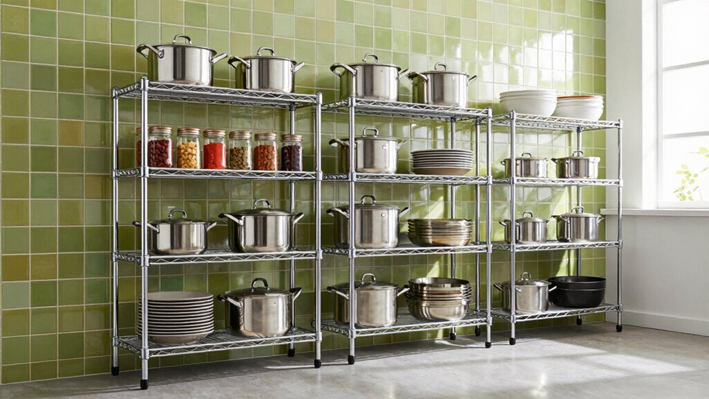 Choosing the right heavy-duty wire shelving unit for your kitchen starts with understanding its load capacity. You need to confirm each shelf can support the weight of your heaviest items, typically at least 250 pounds for heavy kitchen equipment. It’s also essential to verify the total weight capacity of the entire unit, which usually ranges from 1,000 to 2,000 pounds in heavy-duty models. Make sure the weight is evenly distributed across all shelves to prevent overloading and structural failure. Durability matters too; opt for reinforced steel wire capable of handling frequent heavy use without bending or warping. By focusing on these load capacity requirements, you’ll select a unit that’s both safe and capable of meeting your storage needs efficiently.