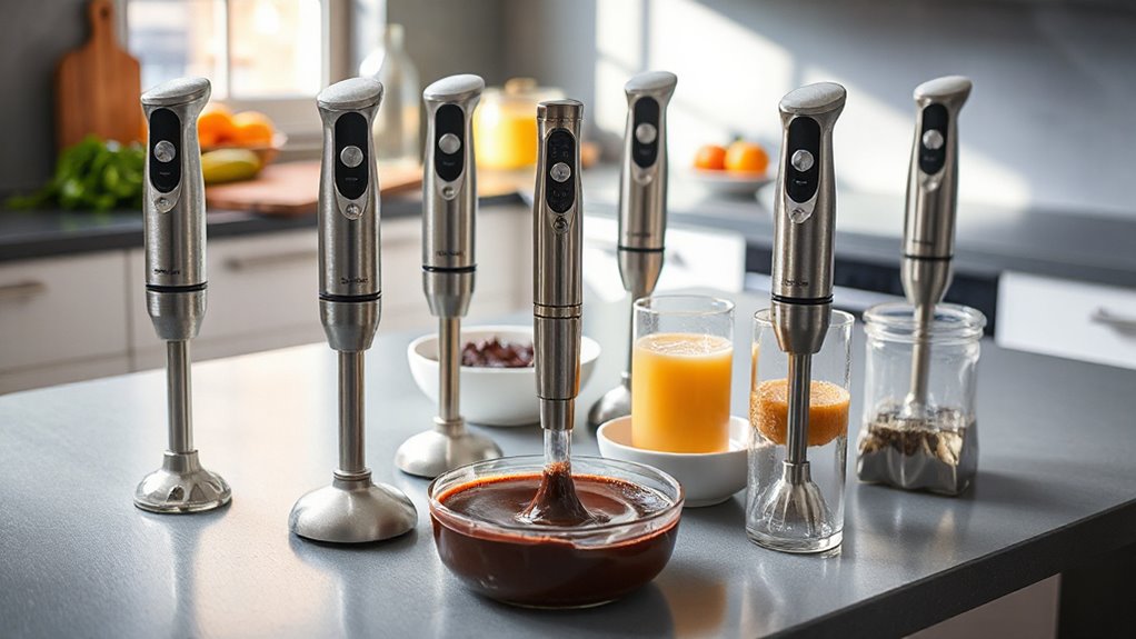 Looking for the best immersion blenders for perfect emulsions and ganache in 2026? I’ve found top models with powerful motors—like 1100W or 1000W—plus variable speeds and attachments for versatility. Features like stainless steel blades, easy cleaning, and ergonomic design also matter. These blenders make creating silky textures simple and efficient. Stay tuned, as I’ll share detailed insights to help you choose the right one for your needs.