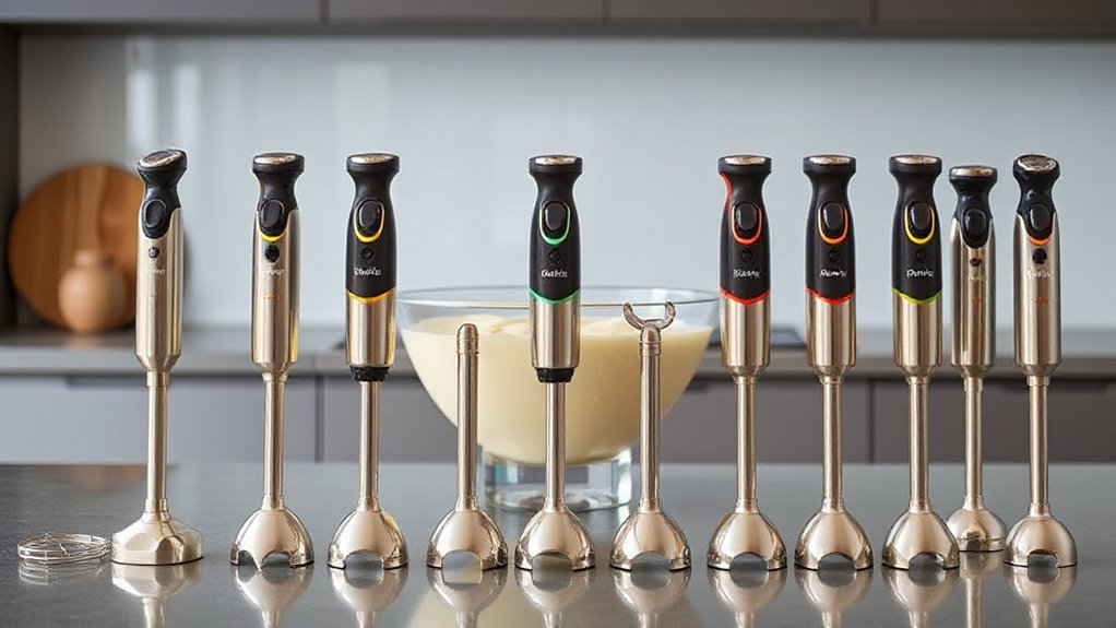 Selecting an immersion blender with the right power and speed options is essential for professional pastry cream preparation. A motor with 500W or more guarantees smooth, consistent mixing of thick creams without struggle. Variable speed settings give me precise control, allowing me to fine-tune the texture and prevent overmixing or splattering. Turbo or boost modes are handy for quick, high-intensity blending, especially when I need thorough incorporation of ingredients fast. Multiple speed options, particularly those with 12 or more, offer flexibility to adapt to different stages of the process and ingredient viscosities. This range of power and speed choices helps me achieve the perfect pastry cream consistency efficiently, making my work more precise and consistent.