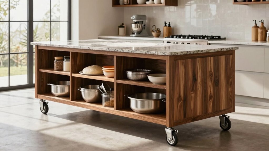 Adequate storage is essential for bakers using a kitchen island on wheels, as it keeps all tools and ingredients within easy reach. Large drawers and cabinets are key, providing space for baking tools, ingredients, and equipment. Adjustable shelves allow me to customize storage for different-sized supplies, guaranteeing everything fits neatly. Multiple compartments, like spice racks and utensil drawers, help me organize small items and reduce clutter. Dedicated storage for frequently used items, such as mixing bowls and measuring cups, boosts my efficiency during baking. Additionally, having enough capacity to store bulky items like large mixers or baking sheets ensures the island meets the needs of serious bakers. Well-designed storage options make my workspace more functional and streamline my baking process.