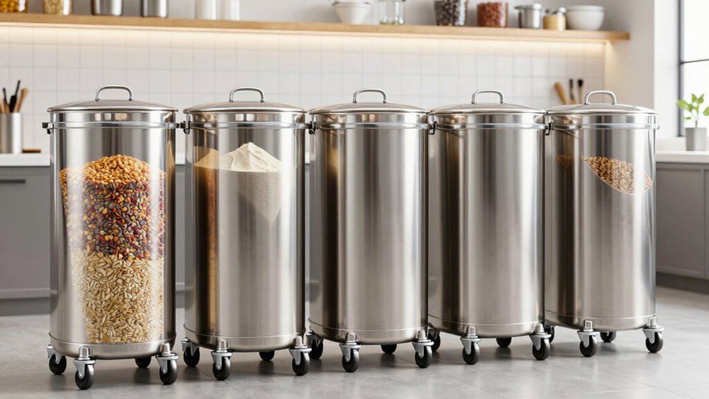 If you’re searching for the 15 best large capacity ingredient bins with wheels in 2026, I’ve got you covered. I’ve found options ranging from 4.5 gallons to over 27 gallons, made from food-safe materials, with features like airtight lids and durable casters. Whether for home or commercial use, these bins make storage easy and organized. Keep exploring to discover detailed reviews and tips to find the perfect fit for your needs.