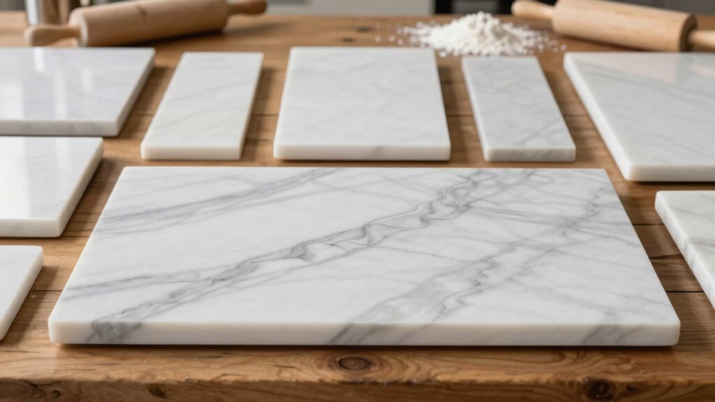Selecting the right size for a large marble pastry board is key to creating an efficient workspace. Ideally, it should measure at least 16×20 inches to provide enough room for rolling dough and preparing baked goods comfortably. The size of your workspace needs to match the scale of your common recipes, like pizzas, pies, or large cookies, to ensure ease and comfort. Thicker boards, around 0.75 inches, add stability and durability, especially for extensive baking tasks. It’s important to choose a surface area that allows for smooth movement of ingredients without feeling cramped. A spacious marble board minimizes the need to reposition items constantly, making it perfect for serious home bakers or professionals. Overall, the right size enhances your workflow and makes baking more enjoyable.