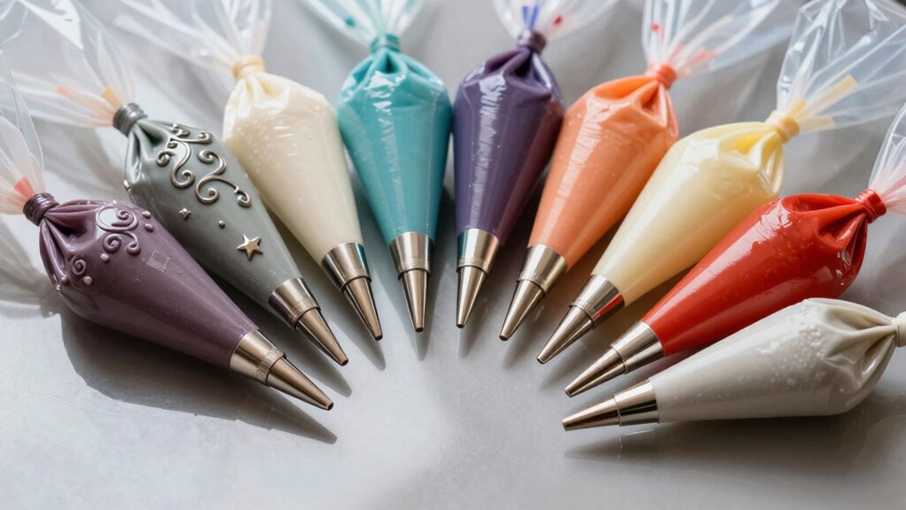 Opting for a piping bag with the right capacity is essential for efficient decorating, especially when working on large surfaces or multiple designs. Larger bags, typically 12 to 16 inches, allow me to hold more frosting, reducing the need for frequent refills during extensive projects. Reusable bags made from durable silicone or heavy-duty fabric are environmentally friendly, withstand repeated use, and save money over time. They’re easy to clean and maintain, making them a practical choice for professional use. Disposable bags, on the other hand, offer convenience and hygiene but tend to have smaller capacities and generate more waste, making them less ideal for large-scale decorating. Ultimately, selecting the right capacity and reusability depends on my specific needs and the scope of each project.