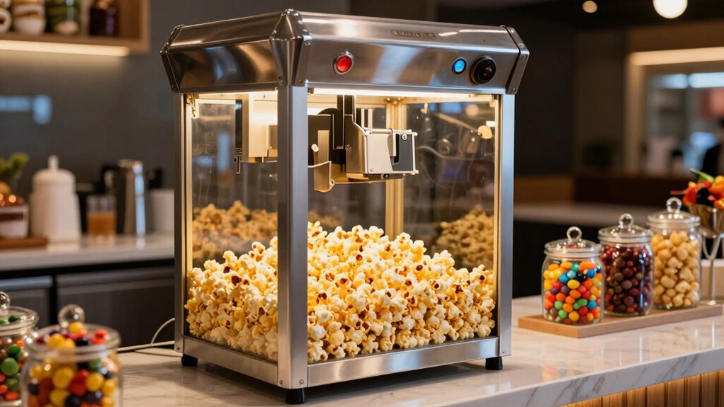 A commercial popcorn machine typically lasts around 5 to 10 years, depending on usage and maintenance. I’ve found that regular cleaning and proper handling can extend its lifespan considerably. If you keep it in a commercial setting with high volume, though, it might wear out closer to five years. Investing in quality equipment and following the manufacturer’s guidelines helps guarantee it stays reliable and efficient longer.