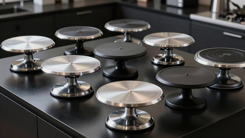 Since ease of cleaning is essential for maintaining hygiene and efficiency, I always look for turntables with smooth, non-porous surfaces like stainless steel or sealed aluminum. These materials prevent residue buildup and make wiping down quick and straightforward. Turntables with removable components or surfaces that can be easily cleaned save valuable time during busy workdays. Non-stick coatings or textured surfaces help minimize frosting and icing sticking, simplifying cleanup. Dishwasher-safe models are a great option, especially in professional settings, as they allow for thorough cleaning without manual scrubbing. Regular maintenance with damp cloths or gentle cleaning solutions keeps the surface hygienic and in top condition. Prioritizing ease of cleaning ensures my workspace stays sanitary and ready for the next cake.