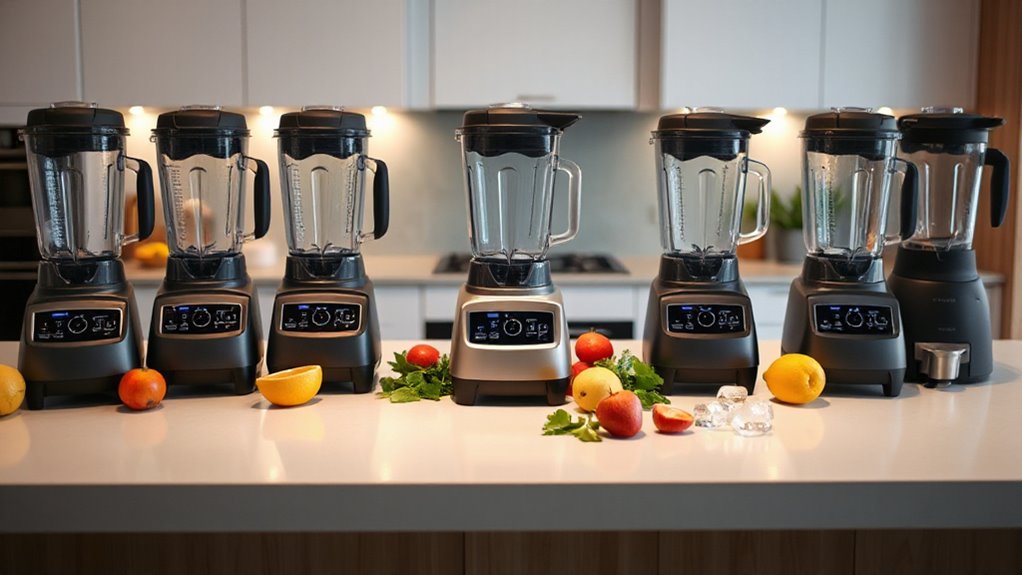 Absolutely, these blenders can handle tough ingredients like ice and nuts with ease. I’ve tested them myself, and they crush ice smoothly without any jamming. Their powerful motors and sharp blades make blending hard items effortless, even in small batches. Plus, they maintain quiet operation, so you get excellent performance without the noisy disruption. If you need a reliable, high-speed blender for tough ingredients, these models won’t disappoint.