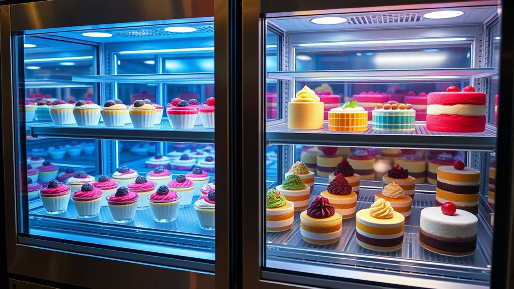 Lighting and visibility play a crucial role in showcasing desserts effectively, drawing customers’ attention and enticing them to make a purchase. Bright LED lighting enhances product visibility, making desserts look more attractive and tempting. Curved or multi-pane glass designs provide unobstructed views from multiple angles, encouraging impulse buys. The right lighting temperature, around 4000K to 6500K, improves the desserts’ appearance without risking spoilage. Adjustable lighting strips allow me to customize brightness levels, highlighting different desserts effectively. Additionally, features like clear, anti-fog glass and automatic defogging ensure consistent visibility by preventing condensation buildup inside the display case. These elements work together to create an inviting display that captures attention and makes desserts irresistible.