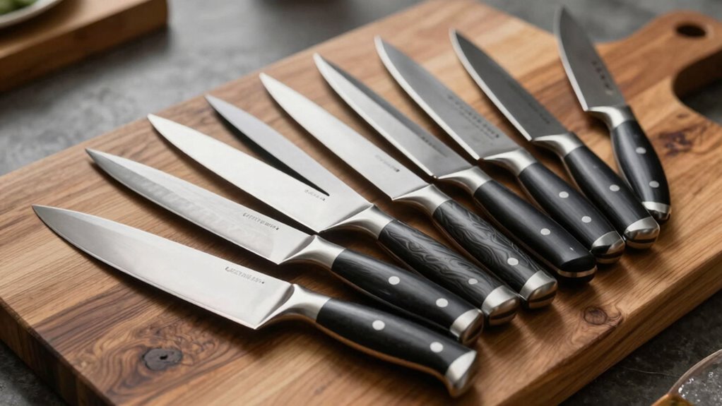 Choosing a santoku knife with the right blade material is essential because it directly impacts the knife’s performance and longevity. High-quality blades are usually made from high-carbon stainless steel or layered Damascus steel, which provide excellent edge retention and durability. The steel’s hardness, measured in HRC, typically falls between 58 and 62; this range balances sharpness and toughness. Premium blades undergo heat treatment and cryogenic tempering, boosting their toughness, flexibility, and corrosion resistance. The steel choice also affects how easily the knife can be sharpened and its resistance to staining, rust, and discoloration. Additionally, the manufacturing process—whether forging or stamping—determines the overall strength, balance, and lifespan of the blade. Investing in quality blade material guarantees a sharper, more durable santoku for years to come.