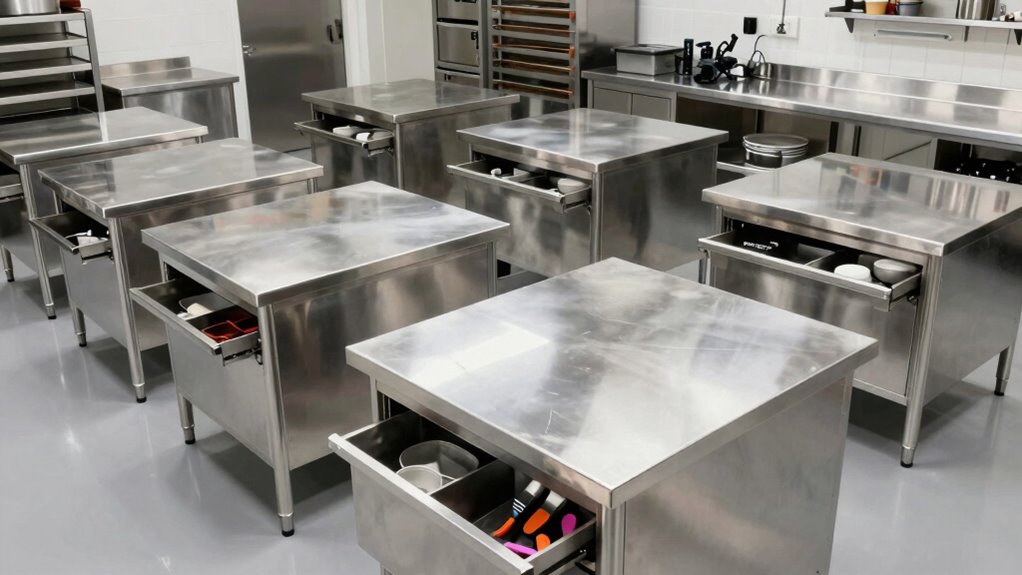 Choosing a stainless steel prep table with drawers requires careful attention to mobility and stability to guarantee safe and efficient use. I look for tables with adjustable legs or leveling feet to keep the surface stable on uneven floors. Reinforced frames and thickened stainless steel plates are essential for supporting heavy loads without wobbling. A sturdy base with a wide footprint helps prevent tipping or shifting during busy baking sessions. Locking caster wheels are a valuable feature, offering easy mobility when needed and secure stability when stationary. Additionally, I verify the weight capacity of the entire setup, including drawers and undershelves, to assure it can handle the demands of daily use. These factors are vital for maintaining safety and productivity in a busy kitchen environment.