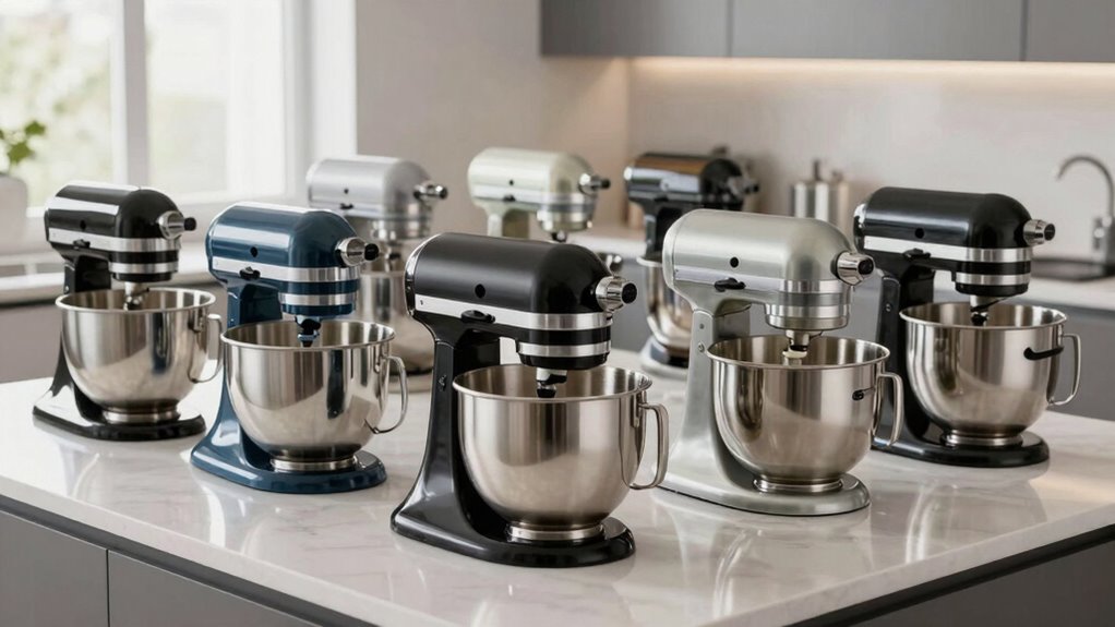 Absolutely, these mixers handle non-traditional ingredients like bread dough and thick batters with ease. I’ve used mine for heavy doughs and sticky batters without any issues, thanks to their powerful motors and sturdy attachments. They’re built to tackle tough ingredients repeatedly, making large-scale baking more manageable. Just guarantee you use the appropriate speed and attachments, and you’ll find these mixers versatile enough for all your baking needs.