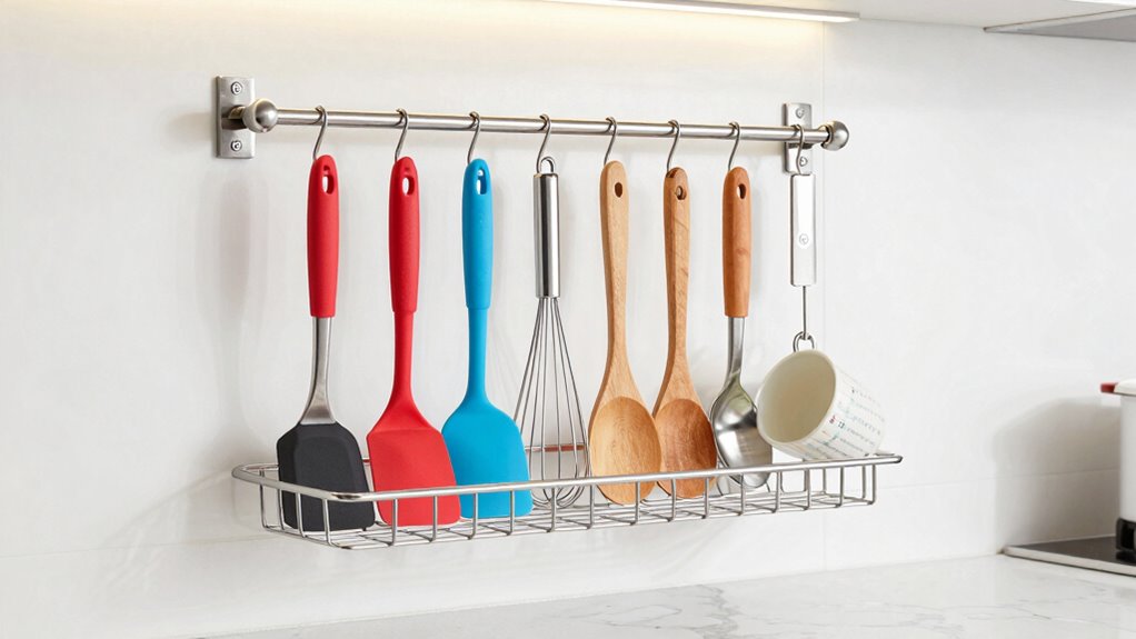 A modern kitchen enthusiast seeking a sleek, space-saving solution will appreciate the black wall-mounted utensil rack with hooks. This 15.75-inch metal rack features six movable hooks, allowing you to customize spacing for spatulas, spoons, and strainers. Its durable construction guarantees reliable storage, while the compact depth of just over two inches keeps your countertop clear. The sleek black finish adds a contemporary touch, and the wall-mounted design with pre-drilled holes makes installation quick and straightforward. This versatile rack keeps utensils within easy reach, organizes your workspace efficiently, and maximizes your kitchen’s functionality without sacrificing style.