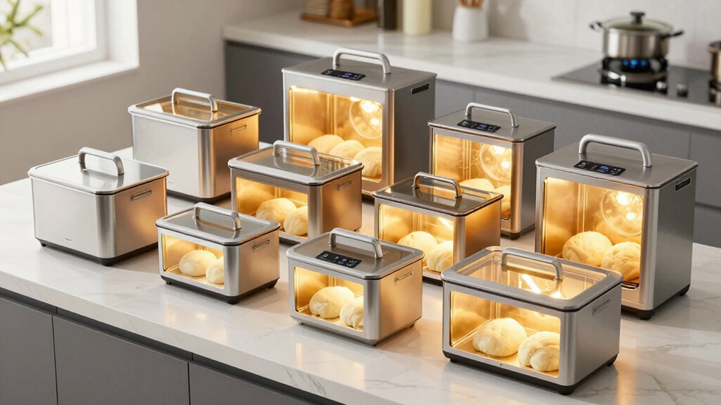 If you’re looking for the 15 best warming boxes for proofing dough in 2026, I can help. These options feature precise temperature controls, timers, durable materials, and compact or foldable designs to fit any kitchen space. Many offer adjustable humidity, large capacities, and easy-to-use interfaces, making proofing and fermentation simpler. Stay tuned to discover which models stand out with advanced features and reliable performance to suit your baking needs.
