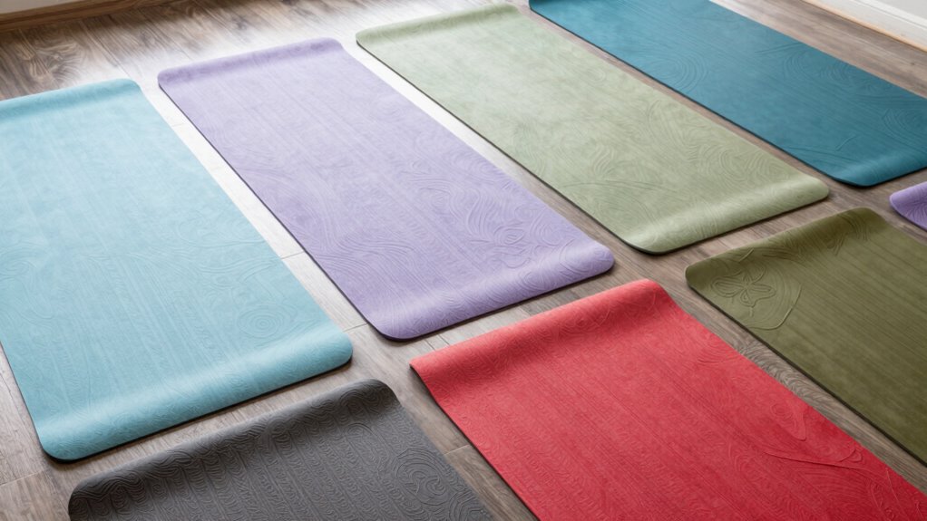 Think of your mat’s texture as the gentle touch of morning dew. A textured surface provides better grip by creating friction, preventing slips during poses or workouts. It also adds a layer of comfort by cushioning your skin, making each movement feel more natural. I find that choosing a textured mat helps me stay steady and relaxed, allowing me to focus fully on my practice without distraction.